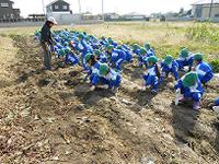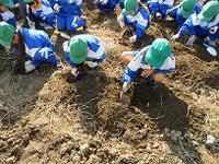 1年生の子供たちがさつまいもの収穫をしました。子供たちは固めの土に苦労しながらも、一生懸命掘っていました。さつまいもを掘り当てるととてもうれしそうで、収穫することの喜びを味わっていました。 |