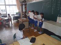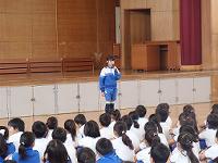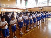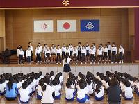 音楽朝会では、3年1組の子供たちが、市内音楽会(10月27日)で発表する「Tomorrow」「いのちの歌」の2曲を披露しました。きれいでのびやかに響く歌声に、全校児童から大きな拍手が贈られました。