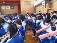 次に、今月の歌「パフ」を全員で合奏しました。1,2年生のカスタネットのリズムと、3,6年生のリコーダーの響きと、4,5年生の鍵盤ハーモニカの音とが重なり合って、明るく心地よい演奏が響き渡りました。 |