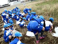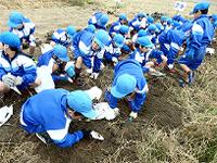 2年生の子供たちがさつまいもの収穫をしました。子供たちは固めの土に苦労しながらも、一生懸命掘っていました。さつまいもを掘り当てるととてもうれしそうで、収穫することの喜びを味わっていました。 |