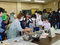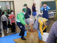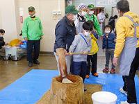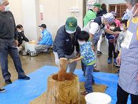 持田公民館で行われた青少年育成会による親子もちつき大会では、西小学校の子供たちや保護者の皆さんがたくさん参加し、もちつきの様子を見たり、実際に体験したりしました。つきたてのおもちはとてもよい香りがしました。子供たちはいろいろな味をつけたおもちをたくさん食べていました。地域の皆さんと一緒に笑顔で楽しいひとときを過ごしていました。 |