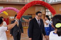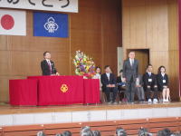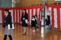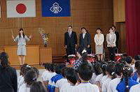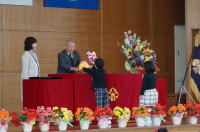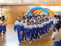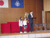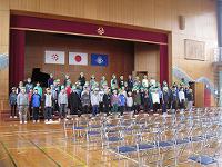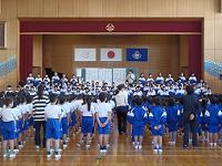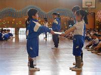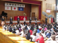 全校児童を代表して、2年生からはお祝いのプレゼントが、4年生からは校歌の歌詞カードが1年生に贈られました。その後、全校児童そろって今年度初めて校歌を歌いました。