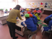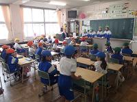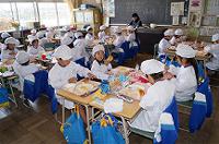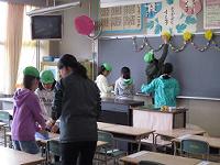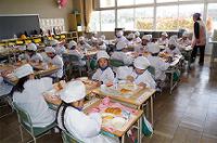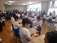 1年生が入学後、初めての給食を迎えました。配膳を6年生に手伝ってもらいながら、各クラスで楽しい給食の時間を過ごしました。みんなおいしそうに給食を食べていました。 |
