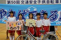 第50回交通安全子供自転車埼玉県大会がくまがやドーム内体育館で行われました。大会は、学科テスト、安全走行テスト、技能走行テストの3つの競技で競いました。県内から41チームの参加がありました。本校の代表児童は今までの練習の成果を発揮し、見事6位入賞に輝きました。ご声援ありがとうございました。 |