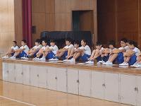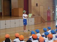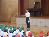 プール使用上の注意について体育主任の先生からお話がありました。「かけない」「とびこまない」「ちゃんと話をきく」を呼びかけました。