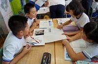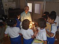 子供たちは、自然エネルギー発電やエコな電球などについて学びました。また、手回し発電機を使って自分たちで電気をつくる体験をとおして電気を作ることの大変さも理解することができました。今後の環境学習に生かしていきます。 |