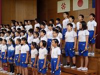音楽朝会で5年生が合唱「いつでもあの海は」と合奏「リボンのおどり」を発表しました。心地よい歌声と演奏が体育館全体に広がり、発表後は大きな拍手に包まれました。
