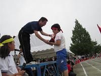 平成28年度西小運動会の優勝チームは「赤組」でした。校長先生から優勝トロフィーが手渡されました。