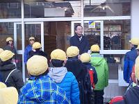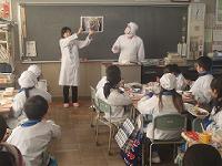 23日(月) 給食の時間、4年生の教室に学校給食センターひまわりの栄養士さんや調理員さんをお招きして、学校給食がどのようにつくられているかについて、お話をしていただきました。 子供たちはとても真剣に話を聞き、調理の様子や調理に使う道具などについて学んでいました。