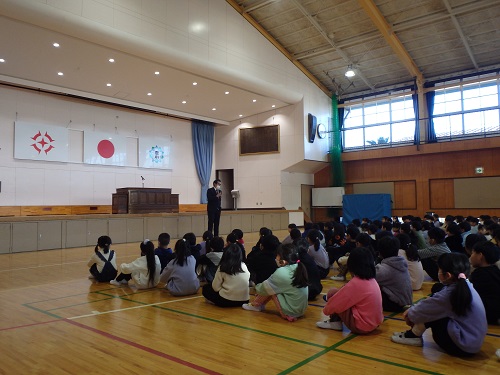 第3学期 始業式 明けましておめでとうございます。今年もよろしくお願いいたします。 今年の干支は「辰」です。この辰には、陽気が動いて万物が振動し、草木も成長して形が整った状態と解釈されているようです。校長先生が式の中でお話されていたように、結果と結びつく年でもあるので、さらに大きく成長できるように頑張ってほしいと願っています。 式の後には、安全主任から、①災害が起きたときの対応、②交通事故にあわないために、③不審者への対応についてお話がありました。ご家庭でも、いざというときに命が守れるようにお話しください。