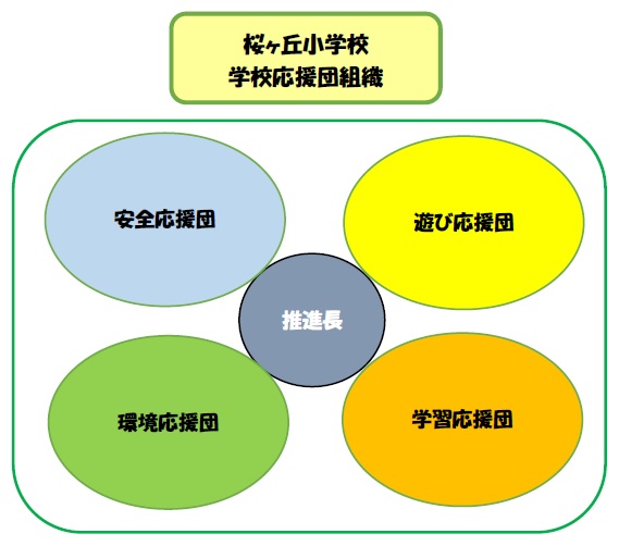 本校では、地域とともに歩む学校の実現を目指し、家庭や地域社会の教育力の向上を図り、学校・家庭・地域が一体となって子どもの健全育成に取り組んでおります。推進長(コーディネーター)を中心に、4つの応援団を組織し、それぞれの応援団が子どもの学習活動、学校行事、昼休みや登下校の見守りなどさまざまな応援をしています。